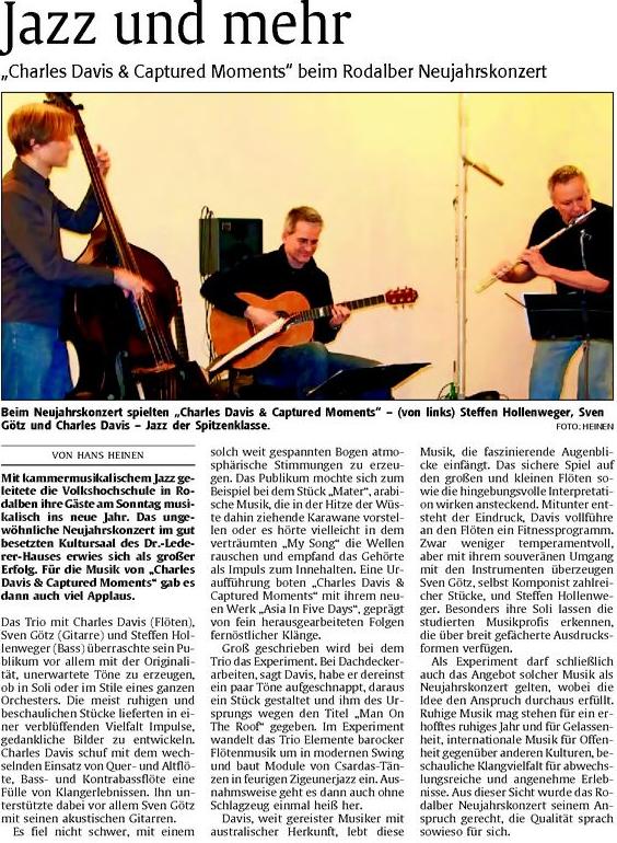 "Das Trio "Charles Davis & Captured Moments" durchstreifen auf ihrer musikalischen Reise nicht nur Kontinent von Europa, Arabien und Indien bis China, sondern auch Zeiten von Barock bis Rock."